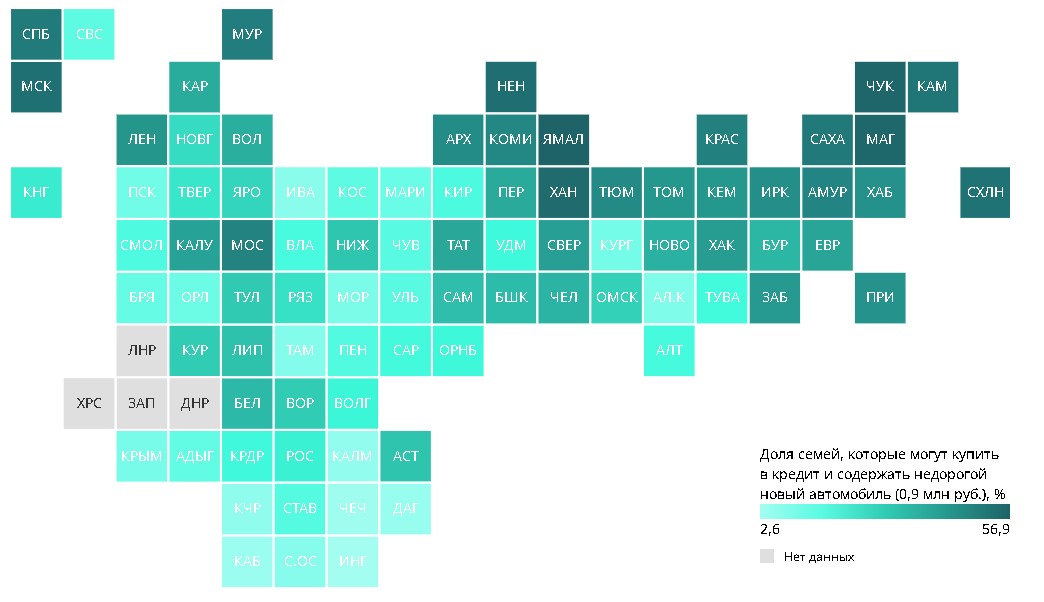 Для оценки региональных различий по доступности покупки нового автомобиля эксперты составили ежегодный рейтинг регионов по доле семей, которые могут позволить себе приобрести новую машину в кредит и оплачивать текущие расходы, связанные с ее эксплуатацией.