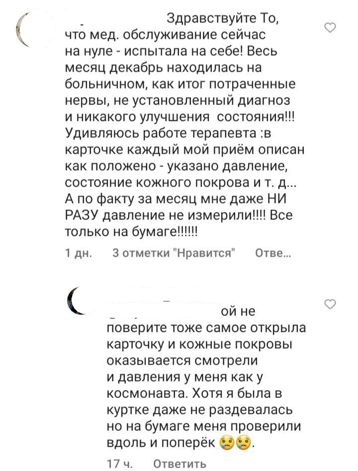 Весь декабрь находилась на больничном, как итог: потраченные нервы, не установленный диагноз и никакого улучшения состояния. В карточке каждый мой прием описан как положено – указано давление, состояние кожного покрова и т.д., а по факту за месяц мне даже давление ни разу не измерили, все только на бумаге.