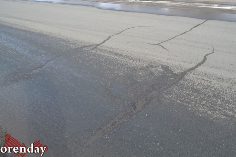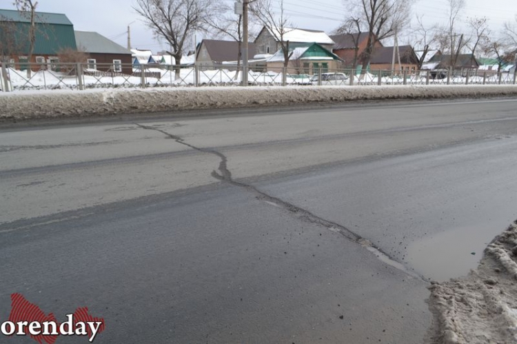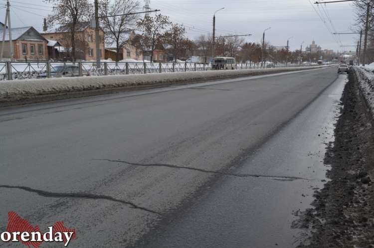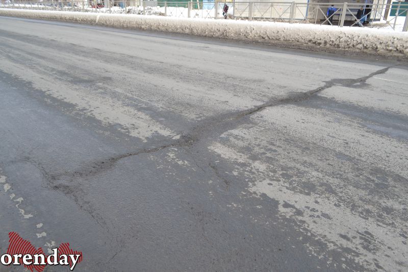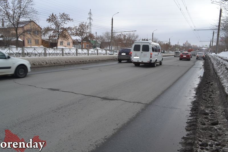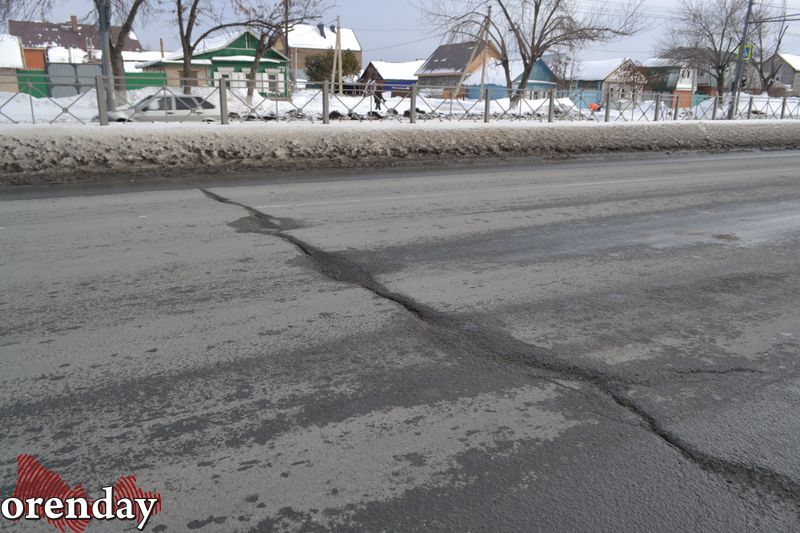 Начиная от путепровода и до перекрестка с улицей Орской примерно каждые 3 - 5 метров машины «подпрыгивают», натыкаясь на продольные трещины. Они «украшают» все три полосы движения в сторону центра. Кое-где разломы превратились в ямы, заполняясь лужами от талого снега. Чем ближе к центру, тем трещины становятся тоньше, но их количество просто шокирует.