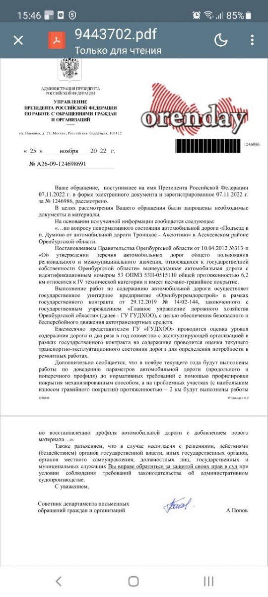 Как стало известно, дорога принадлежит ГУ ГУДХОО, а выполнение работ по содержанию автомобильной дороги «Подъезд к п. Думино от а/д Троицкое -Аксютино» осуществляет «Оренбургремдорстрой».