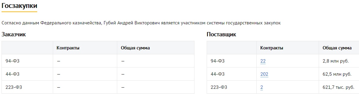 Согласно открытым источникам, на его счету 226 госконтрактов на 687 млн. рублей.