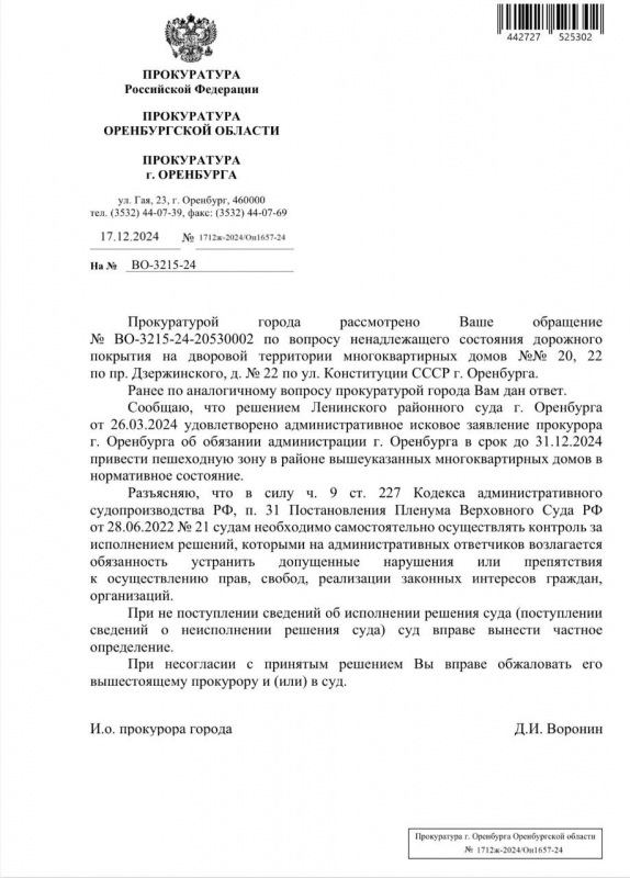 Решением Ленинского районного суда Оренбурга от 26 марта 2024 года было удовлетворено административное исковое заявление прокурора Оренбурга об обязании администрации в срок до 31 декабря 2024 года привести пешеходную зону по указанным адресам в нормативное состояние. Однако, по сей день решение не исполнено. Более того - не проводились и работы по благоустройству и озеленению, неосмотря на неоднократные обращения по данным вопросам.