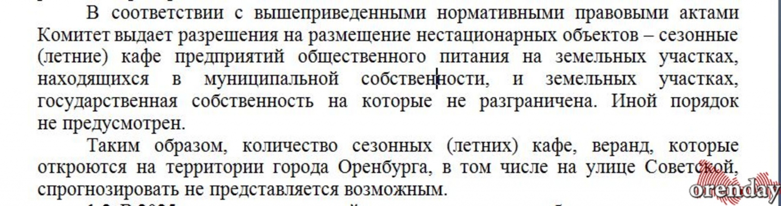 На территории Оренбурга не определен сезон работы летних веранд, уличных кафе, так как на земельных участках, находящихся в частной собственности, собственники самостоятельно принимают решение об открытии сезонных кафе, руководствуясь целесообразностью, обусловленной температурным режимом и погодными условиями.