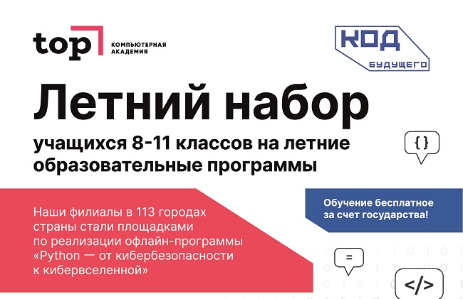 Компьютерная Академия ТОР принимает активное участие в реализации проекта «Код будущего. Летний интенсив» и ведет набор учащихся на бесплатные образовательные курсы. Наши филиалы в 182 городах страны стали площадками по реализации проекта.