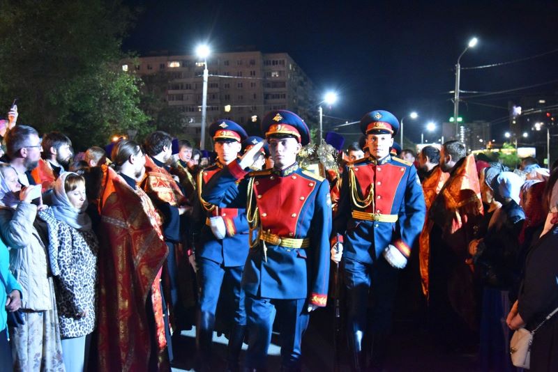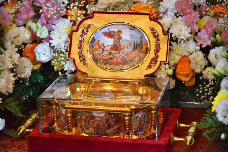 У памятника оренбургскому казачеству на пересении улиц Чкалова и Степана Разина под покровом ночи святыню встретили митрополит Оренбургский и Саракташский Вениамин с духовенством оренбургской епархии. Делегация с мощами остановилась у сквера имени владыки Леонтия у стелы «Оренбуржцам - героям Первой мировой войны» с мозаичной иконой святого Георгия Победоносца. Крестным ходом ковчег с мощами принесли в Никольский кафедральный собор. Возглавила шествие рота почетного караула. Крестный ход сопровождали военнослужащие, казаки, прихожане и учащиеся оренбургской духовной семинарии.