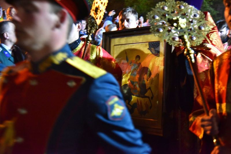 Как следовало из речи митрополита, это знаменательный день для местной епархии. Получить благословение от великого покровителя воинства русского сможет любой желающий, независимо от вероисповедания. Сегодня в течение всего дня до отбытия честных мощей в храме будет совершаться непрестанно молебное пение перед ковчегом, в котором священнослужители будут просить великомученика, чтобы он даровал победу нашим воинам и уберег их от врагов.