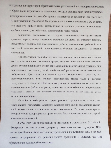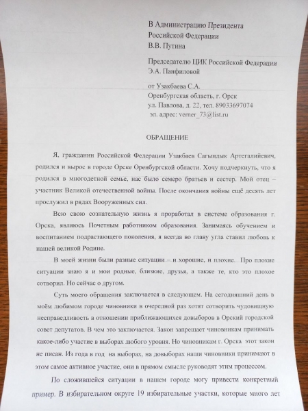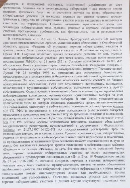 По этому поводу к прокурору Ленинского района Орска уже обратился депутат Заксоба Оренбургской области Вячеслав Ращупкин. Проверка ведется. Кроме того, в адрес председателя областной избирательной комиссии, главы Орска, председателя территориальной избирательной комиссии Советского района Орска направлялись обращения жителей с подписными листами. Граждане просили чиновников вернуть избирательные участки на прежние места, но получили в ответ лишь "отписки". Теперь в суд обратился и Сагындык Узакбаев.
