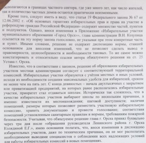 Все перечисленные выше бывшие и нынешние адреса находятся в Советском районе Орска и, соответственно, никакого отношения к Елене Колядиной из Ленинского района не имеют. Кроме того, в силу понятных объективных причин, связанных с отсутствием доступности транспорта и пешеходной логистике, значительной удаленности от мест проживания, большая часть потенциальных избирателей - как известно, людей пожилых - физически будет не в состоянии явиться на вновь образованные избирательные участки. За несколько десятков лет жители "старого города" привыкли к тому, что их избирательные участки всегда находились и находятся в известных им учреждениях. Помимо названного практического вреда для реализации избирательных прав граждан, решение о переносе избирательных участков противоречат требования как федерального, так и регионального законодательства, - заявил Узакбаев.
