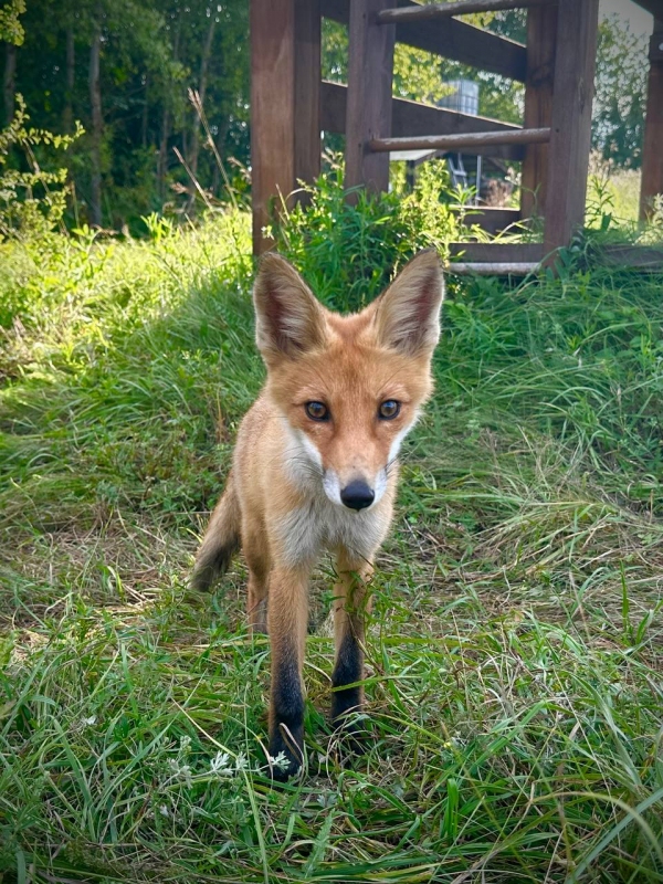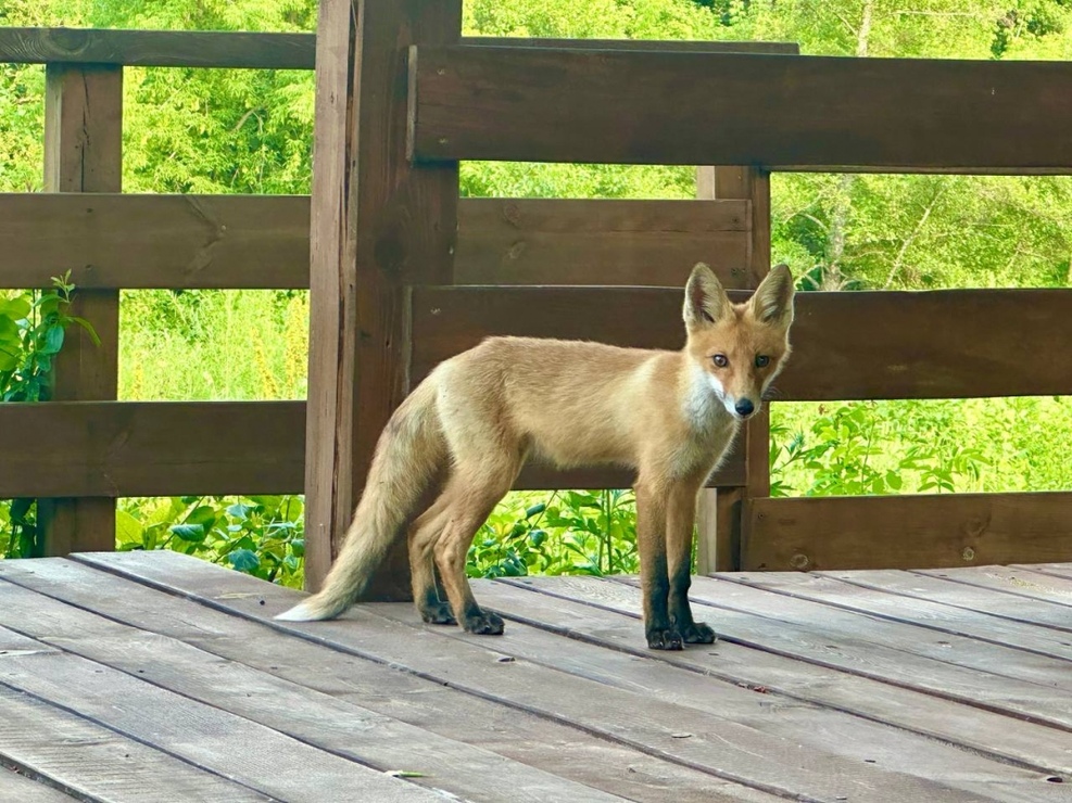 Лисёнок с любопытством озучает гостей в кемпинге. Как утверждают сотрудники нацпарка, его родительница – столь же «коммуникабельна», это лисица по прозвищу Шишка – животное стало знаменитым после прошлогоднего фестиваля «Симфония Бузулукского бора».