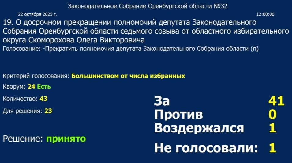 В Оренбурге во время заседания Законодательного собрания Оренбургской области депутаты приняли прекращение полномочий депутата от КПРФ Олега Скоморохова. Во время голосования большинство сказали «За» и только один человек воздержался от принятия решения. Председатель законодательного собрания Сергей Грачев сказал, что ему жаль, что депутат покидает Заксоб. Спикер ЗС обратил внимание на то, что Скоморохов за все 4 года работы сделал очень мало выступлений на заседаниях.