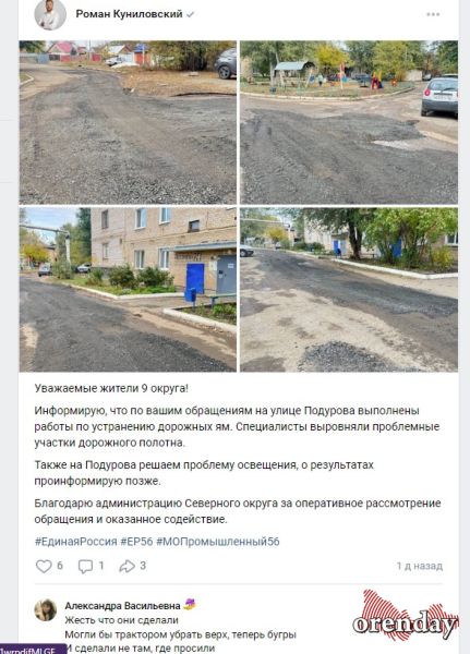 Депутат Оренбургского городского Совета Роман Куниловский в социальных сетях торжественно отчитался перед жителями округа о том, что на улице Подурова провели работы по устранению дорожных ям.