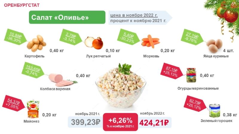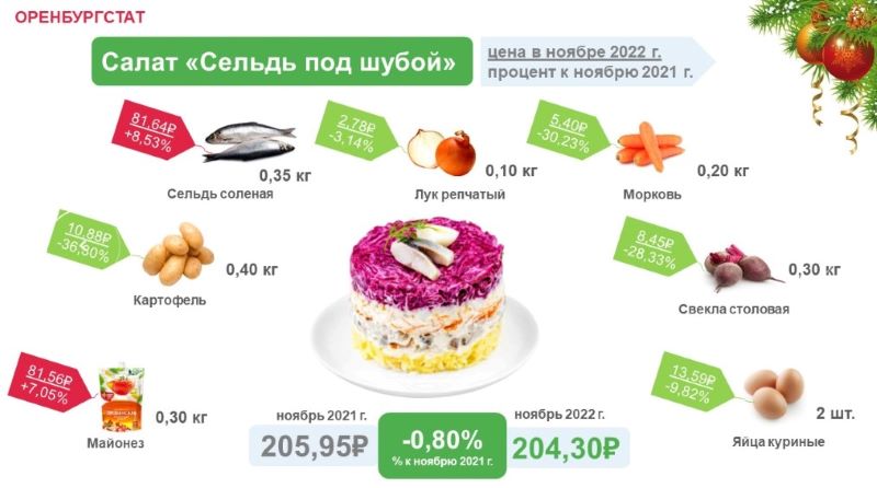 Итак, Оренбургстат рассчитал стоимость и индекc роста цен на традиционные новогодние салаты - «Оливье» и «Сельдь под шубой» в Оренбургской области.