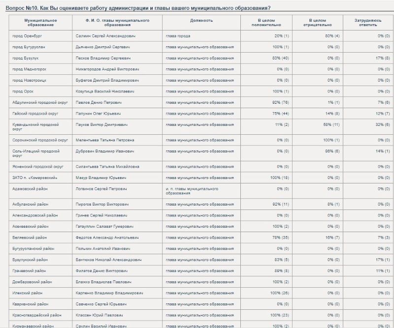 Всего в опросе по всем муниципалитетам Оренбургской области приняли участие почти 400 человек, из них в Оренбурге, помимо нас, ответили всего четыре человека. Сразу видно, в каких муниципалитетах радеют за свой положительный образ, а где - нет. Так, например, в опросе не принял участие ни один житель Медногорска, Новотроицка, Кваркенского, Тюльганского, Первомайского, Шарлыкского, Сакмарского, Сатакташского, Светлинского, Тоцкого, Новосергиевского, Октябрьского, Матвеевского, Новоорского районов.