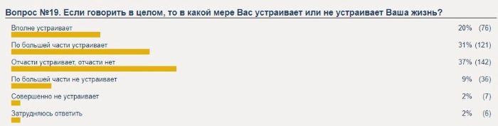 Заглянем в результаты опросника по Оренбургу. 60 процентов из немногочисленных пяти принявших участие в опросе человек не удовлетворены количеством транспортных единиц на маршрутах общественного транспорта, а также состоянием дорог и дорожного покрытия в зимний период. Никто из опрошенных не считает, что дороги в областном центре лучше, чем в соседних регионах. Работу мэра Сергея Салмина и его команды в целом положительно оценил 1 человек, а вот четыре других - отрицательно (среди ответивших был даже один студент), трех из пяти - по большей части устраивает их жизнь.