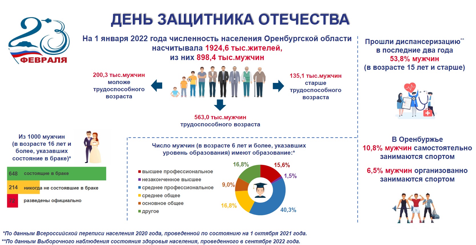 Всероссийская перепись, проведенная в Оренбургской области, показала, что 15,6% мужчин имеют высшее образование; 40,3% - средне профессиональное; 16,8% - среднее общее; 9,0% - основное общее; 1,5% - незаконченное высшее образование; а 16,8% предпочли и вовсе умолчать, что они оканчивали.
