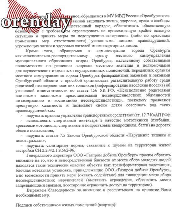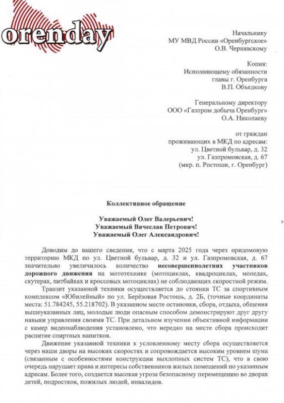 Как указывают начальнику МУ МВД России «Оренбургское» Олегу Чернявскому, исполняющему обязанности главы Оренбурга Вячеславу Объедкову и гендиректору «Газпром добыча Оренбург» Олегу Николаеву в своем письме жители домов № 32 по Цветному бульвару и № 67 по улице Газпромовской, «движение указанной техники к условленному месту сбора осуществляется через наши дворы на высоких скоростях и сопровождается высоким уровнем шума».
