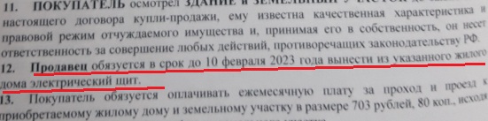 Вскоре был заключен договор купли-продажи. Отдельным пунктом в нём оговорили, что предыдущий владелец обязуется убрать распределительную электрощитовую до февраля 2023 года. На словах же новому собственнику сделать это пообещали гораздо раньше.