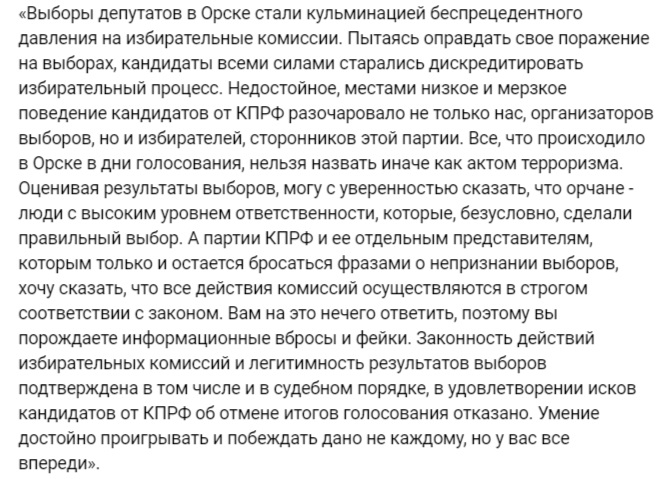 Председатель избирательной комиссии Оренбургской области заявила, что «КПРФ проиграла все суды» по итогам муниципальных выборов.