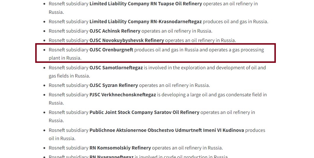 Под санкции попало единственное в Оренбуржье предприятие - дочерняя Ростнефти компания Оренбургнефть. Активы компаний, оказавшихся под санкциями, заблокированы в США. Гражданам и компаниям из штатов запрещается осуществлять какие-либо сделки с этими организациями, иностранные банки, совершающие операции в пользу этих компаний могут так же попасть под санкции.
