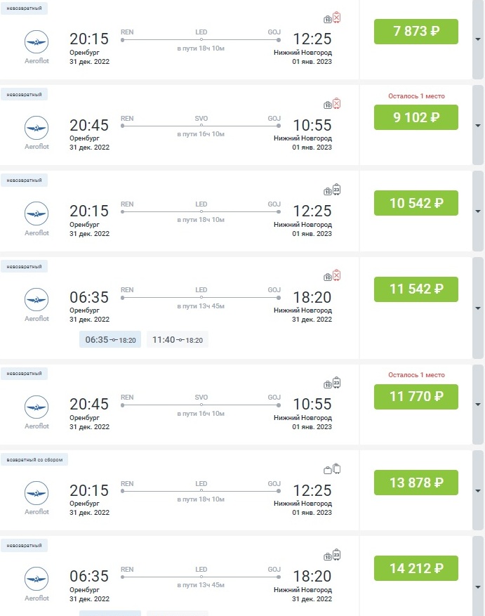 До Нижнего Новгорода из Оренбурга долететь можно, отдав 7 873 рублей. Стоимость перелёта в Сочи начинается от 25 628 рублей, в Новосибирск - от 9 199 рублей, в Казань - от 7 873 рублей.