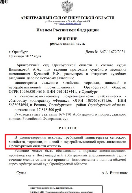 В итоге, дело дошло до суда. В минувшем сентябре министерство сельского хозяйства, торговли, пищевой и перерабатывающей промышленности Оренбургской области подало в Арбитражный суд региона иск к сельхозпотребительскому снабженческо-сбытовому кооперативу «Феникс» о взыскании средств гранта. Суд данное исковое заявление рассмотрел и принял решение в удовлетворении исковых требований минсельхоза области отказать.