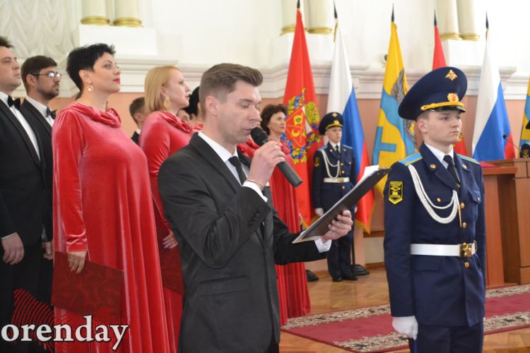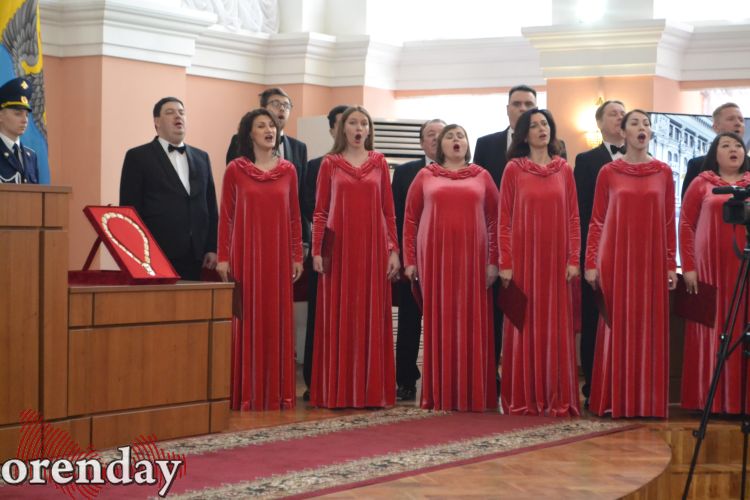 Зазвучал гимн Оренбурга в исполнении хора Почетного гражданина Оренбурга Ольги Серебрийской.
