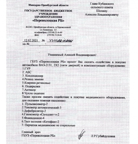 Главы собрались и совместно написали письмо с просьбой о санитарном автомобиле с оборудованием для оказания неотложной помощи. Ответ пришел сразу. Укомплектованный автомобиль спонсоры вручили Кичкасской амбулатории для работы на нескольких территориях. Как положено в этом случае, «подарок» был поставлен на баланс Переволоцкой РБ. В итоге оборудование забрали. А ведь в селах тоже живут люди! Вообще у нас много вопросов накопилось к руководству Переволоцкой РБ. Например, как будет работать Кичкасская амбулатория? Специалисты посещают ее раз в неделю, от этого огромные очереди. У сельчан нет возможности попасть на прием к врачу, - глава Кубанского сельсовета Алексей Шопин.