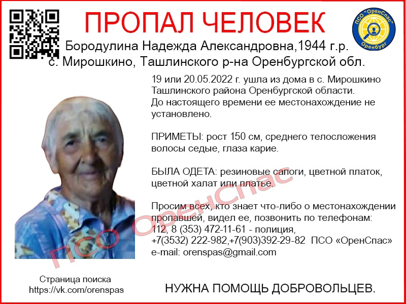 Если вам известно, где находится Надежда Бородулина, или чтос ней случилось, немедленно сообщите по телефонам: 112, 8(3534)72-11-61 - полиция, 8(3532)22-29-82,+7(903)392-29-82 - ПСО «ОренСпас».
