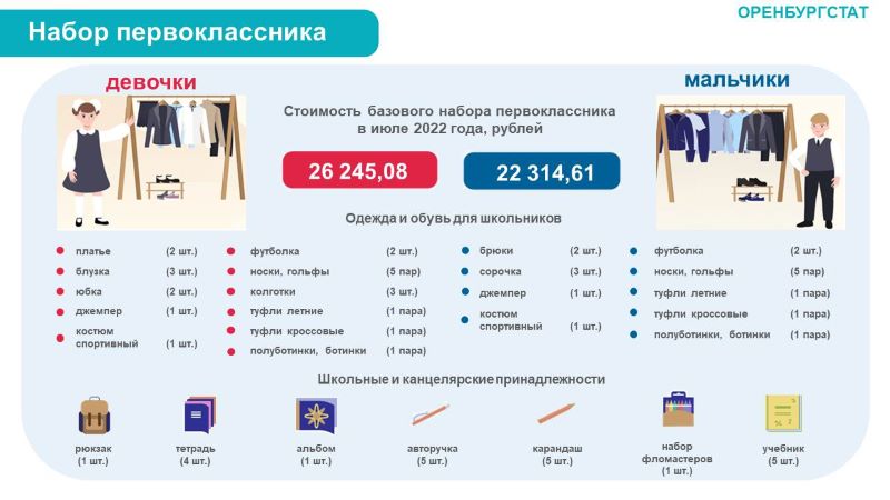 В целом же набор всего необходимого для девочки-первоклассницы обойдется родителям в 26 245 рублей, из которых около 20 тысяч рублей уйдут на покупку одежды и обуви. Набор для мальчиков обойдется немного дешевле - 22 315 рублей, из которых на одежду и обувь уйдут порядка 16 тысяч рублей.