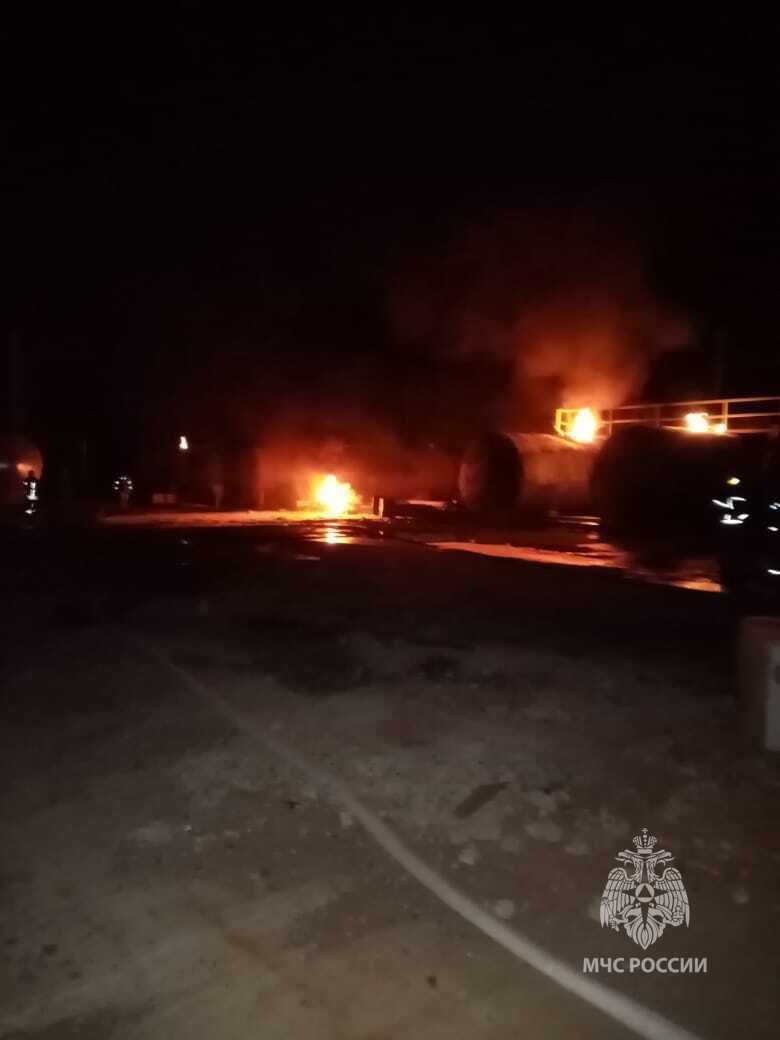 Ориентировочная площадь пожара - 500 квадратных метров. С огнем борются 39 сотрудников регионального управления МЧС. Огнеборцы ведут пенную атаку на горящие резервуары с топливом. Так же на место возгорания прибыл заместитель начальника регионального управления МЧС.