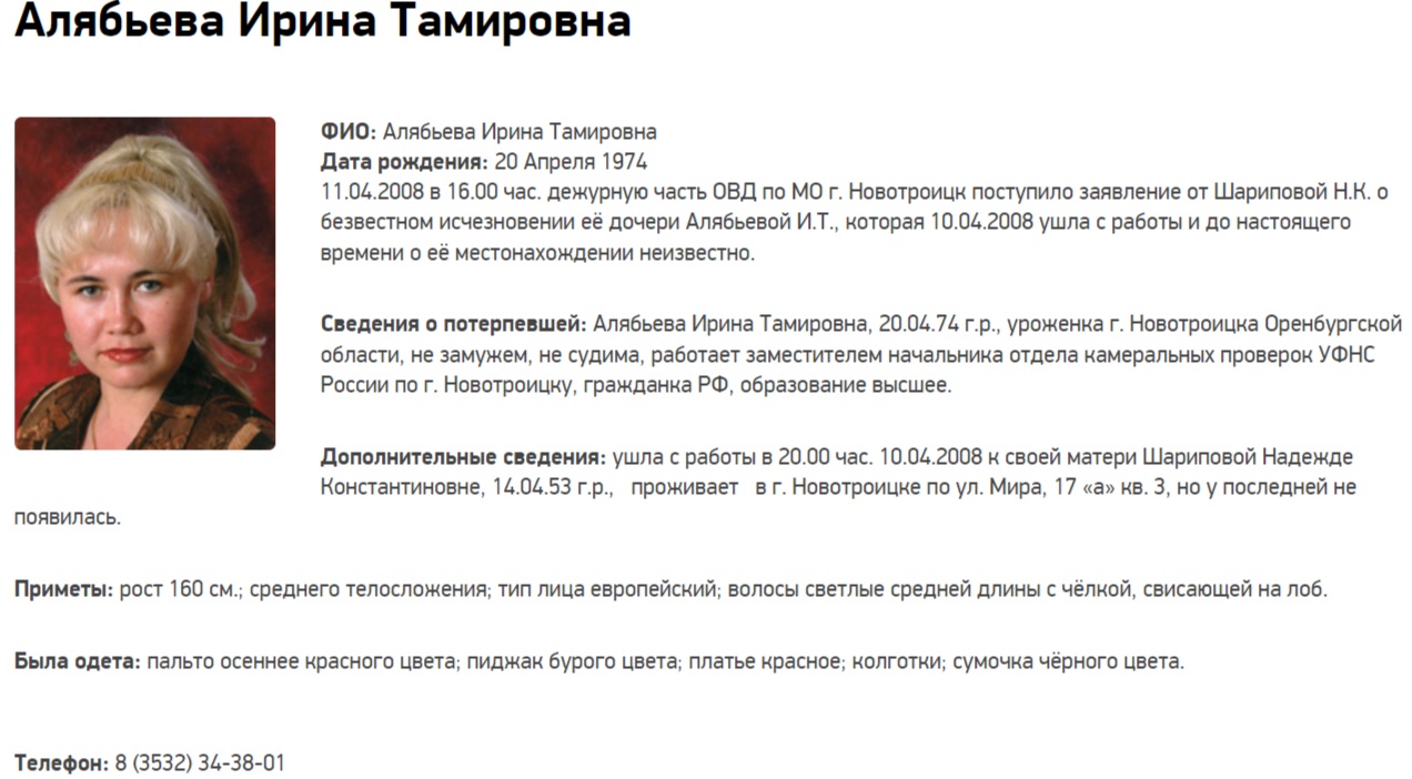 Вот, например, Ирина Тамировна Алябьева, 1974 года рождения не судима, с высшим образованием и при должности заместителя начальника отдела камеральных проверок УФНС России по городу Новотроицку, ушла с работы в восемь вечера 10 апреля 2008 к своей матери и… с тех пор о ней ничего не известно.