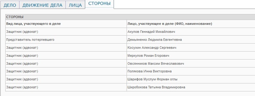 В деле задействовано семь адвокатов: Геннадий Акулов, Александр Косухин, Роман Меркулов, Максим Овсянников, Инна Полякова, Муслум Шарифов и Татьяна Широбокова.