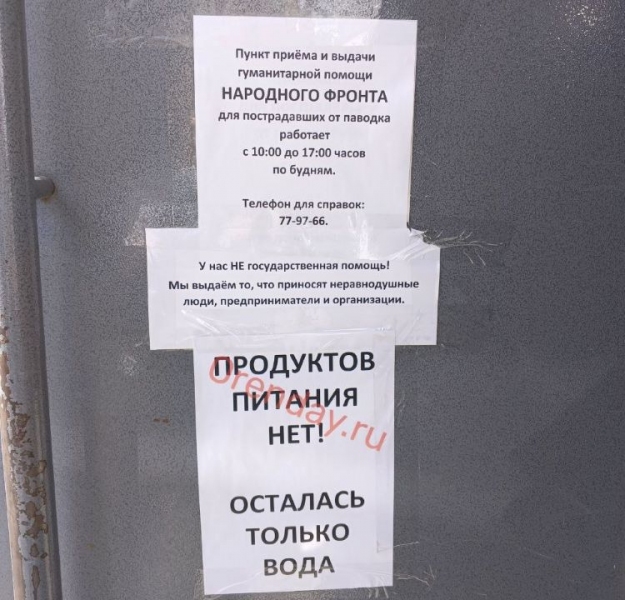 При этом региональное правительство постоянно публикует информацию об очередной пришедшей в Оренбуржье гуманитарной помощи из других регионов. Например, на днях сообщали о 360 тоннах пришедшей гуманитарной помощи пострадавшим от паводка от киргизского народа. 20 большегрузных автомобилей привезли в Оренбург по поручению Президента Киргизской Республики муку, масло, консервы, крупы, матрасы, кровати и отопительные печи.