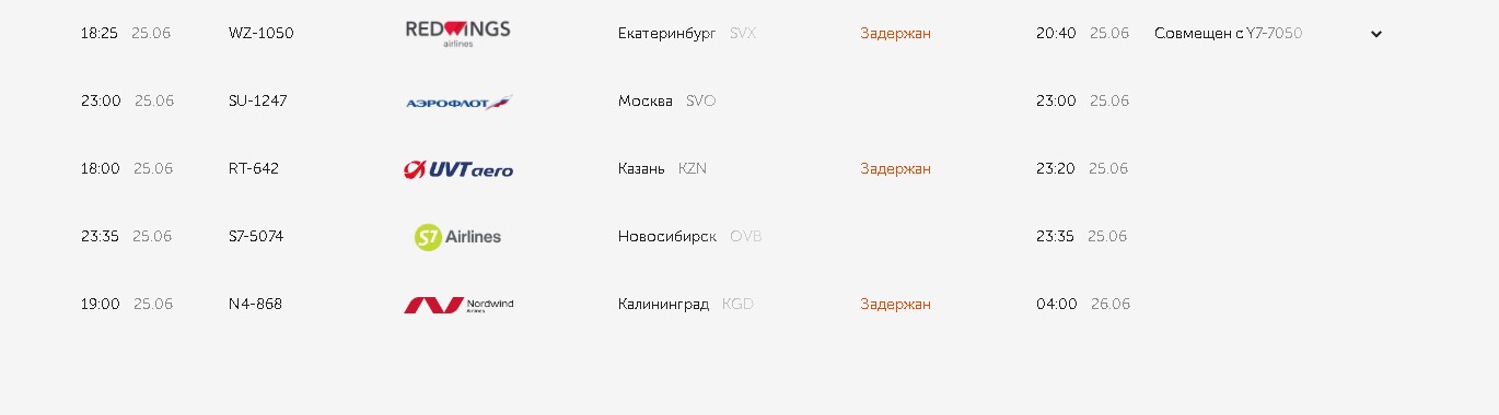 В международном аэропорту Оренбурга, судя по табло, задержаны три рейса в Екатеринбург, Казань и Калининград. Рейс в Екатеринбург должен отправиться в 18.25 бортом авиакомпании Red Wings, но рейс перенесен на 20:40, в Казань в 18.00 самолетом авиакомпании UVT Aero, перенос на 21:40 и Калининград в 19.00, перенос на 4 утра 26 июня, полет осуществляет компания Nordwind Airlines.