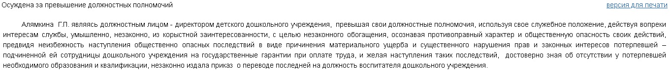 В итоге, Алямкина Г.П. признана виновной в совершении преступления, предусмотренного ч. 1 ст. 286 УК РФ: ей назначено наказание в виде штрафа в размере 30 000 рублей. Не согласившись с вынесенным вердиктом, осужденная обжаловала приговор суда в вышестоящие суды, но судами апелляционной и кассационной инстанций приговор Ташлинского районного суда оставлен без изменения.