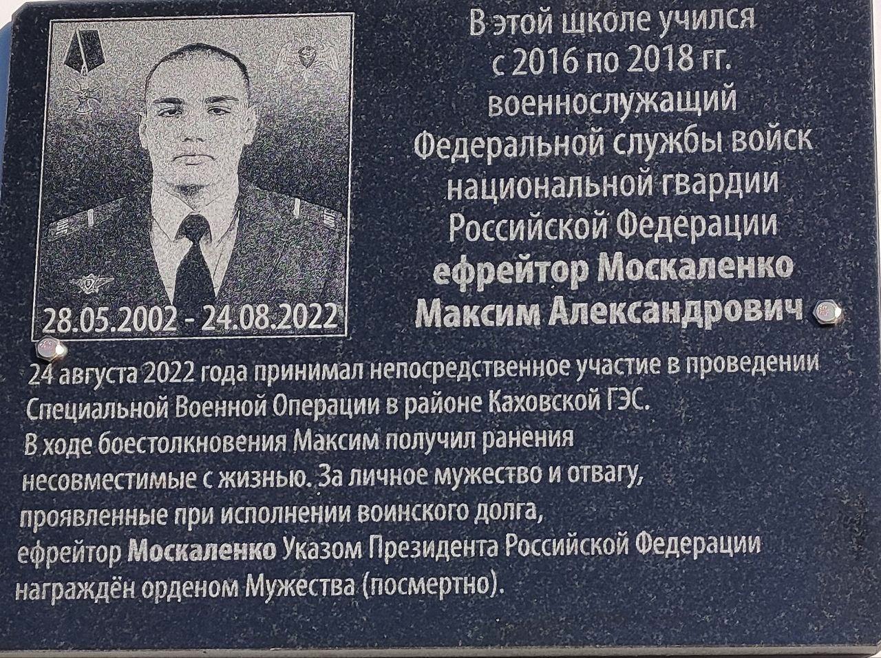 С 5 августа 2022 года Максим участвовал в СВО на Украине. 24 августа в 14:30 колонна специального моторизованного полка на обводном мосту в районе Каховской гидроэлектростанции подверглась обстрелу ракетными системами залпового огня «HIMARS». В результате прямого попадания ракеты в автомобиль «Урал» наш земляк получил ранения несовместимые с жизнью. Максиму Москаленко было всего 20 лет...