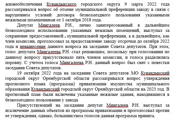 Кстати, пока депутатом остается и Рустам Мингалеев, которого суд также из-за неурегулированного конфликта интересов досрочно лишил депутатских полномочий, но решение суда пока не вступило в законную силу. Он тоже в последний день подал на обжалование решения, ссылаясь на то, что случай нарушения у него является единичным и не носит систематический характер, он голосовал по вопросу, не имея на это право, из-за незнания. Суть выявленного антикоррупционным комитетом конфликта интересов кувандыкского депутата представлена ниже: