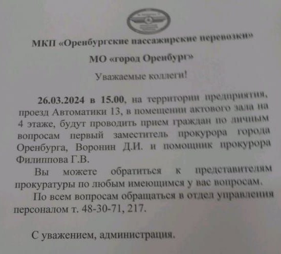 Все это работники, обслуживающие муниципальный транспорт Оренбурга, смогут озвучить сегодня, 26 марта, в 15.00 на встрече с прокурорскими. В стенах МКП "ОПП" (пр-д Автоматики, 13) в актовом зале сегодня прием граждан по личным вопросам проведет первый заместитель прокурора Оренбурга Дмитрий Воронин и помощник городского прокурора.