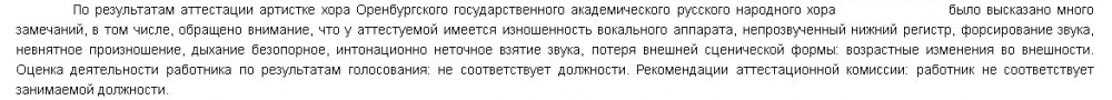 За всю свою трудовую деятельность, а оренбурженка работала в должности артиста хора высшей категории, ее ни разу не привлекали к дисциплинарной ответственности, не было и мелких трудовых нарушений. Все репетиции и концерты посещала исправно и отрабатывала по полной.