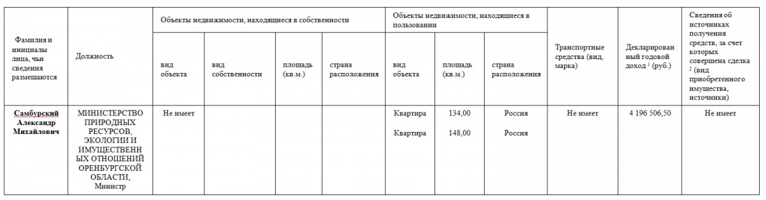 Александр Михайлович Самбурский, министр природных ресурсов, экологии и имущественных отношений региона, получил доход в размере четырех с лишним миллионов рублей. Два объекта, указанные в декларации - квартиры площадью 134 и 148 кв.м. - находятся у него в пользовании.