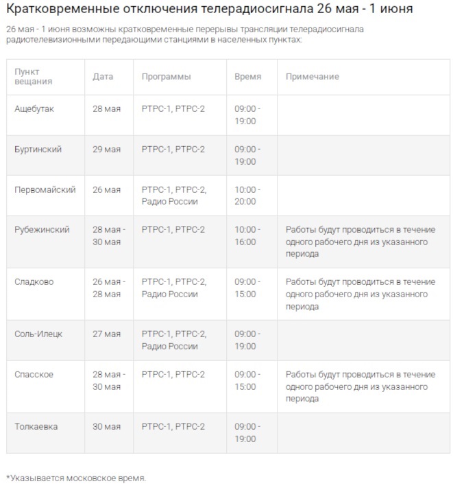 Из-за технических работ с телерадиопередающим оборудованием, которые филиал РТРС «Оренбургский ОРТПЦ» планирует провести с 26 мая по 1 июня, в восьми населенных пунктах Оренбургской области возможны временные отключения бесплатной трансляции телерадиоканалов.