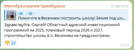 Работа по подготовке к строительству школы в п. Весеннем продолжается, но на данный момент у нас нет информации о сроках реализации проекта (как мы написали ранее). Подвоз учеников из п. Весенний в школу «Экодолье» выполняется, подвоз будет организован и в следующем учебном году. В третьем квартале текущего года начнется строительство школы в ЖК «Приуралье», школа будет сдана в эксплуатацию в 2027 году, часть учеников перейдут туда, численность школьников «Экодолья» уменьшится, - заявили чиновники в ответ на обращения.