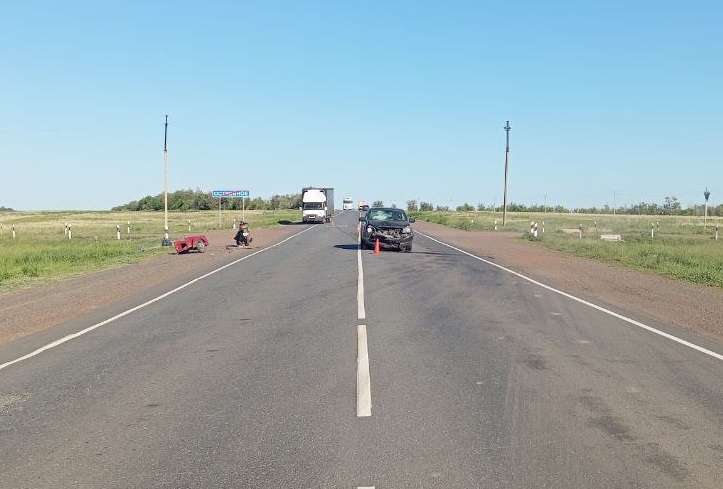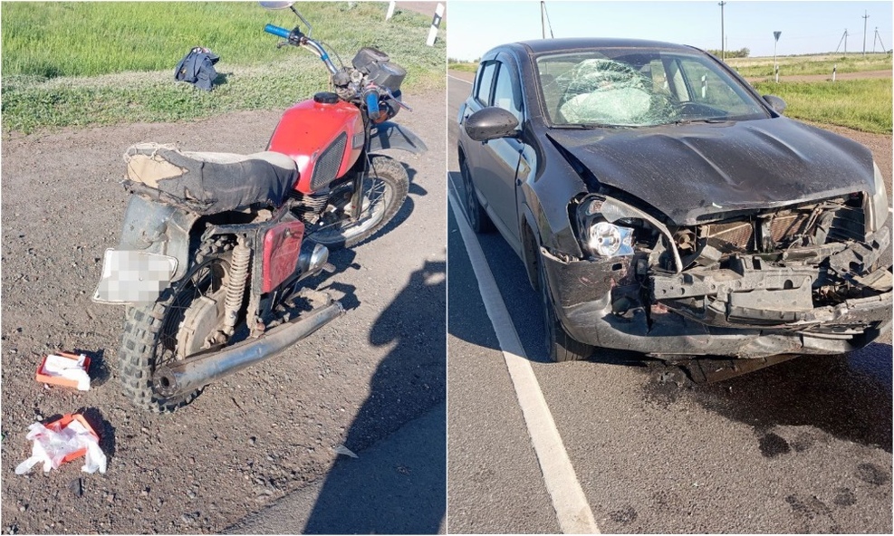 Авария произошла сегодня вечером на трассе М-5 Урал у подъезда к пункту пропуска «Орск». 58-летний водитель мотоцикла «Иж Планета-5», проезжая нерегулируемый перекресток, не уступил дорогу автомобилю «Ниссан», приближавшемуся с правой стороны, из-за чего произошло столкновение.