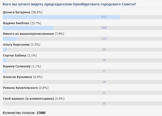 За Дениса Батурина свои голоса отдали 931 человек (58,6%). Вторая позиция у Вадима Бикбова. Его предпочли 408 респондентов (25,7%). Ольга Березнева, бывший председатель Оренбургского Горсовета, практически в одном положении с Бабиным. Ее на прежнем месте хотели видеть только 39 человек (2,5%).