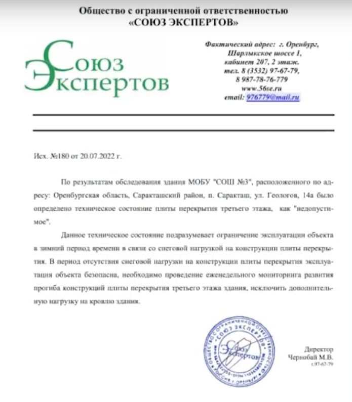 В июле специалисты ООО «Союз экспертов» провели экспертизу здания, от результатов которой волосы шевелятся на голове, у нас в здании, оказывается, уже плиты «поехали»! В заключении сказано, что «техническое состояние плиты перекрытия третьего этажа определено как «недопустимое». Данное техническое состояние подразумевает ограничение эксплуатации объекта в зимний период в связи со снеговой нагрузкой на конструкции плиты перекрытия. В период отсутствия снеговой нагрузки эксплуатация объекта безопасна. Необходимо проведение еженедельного мониторинга развития прогиба конструкций плиты перекрытия третьего этажа здания, исключить дополнительную нагрузку на кровлю здания, - рассказывают родители.