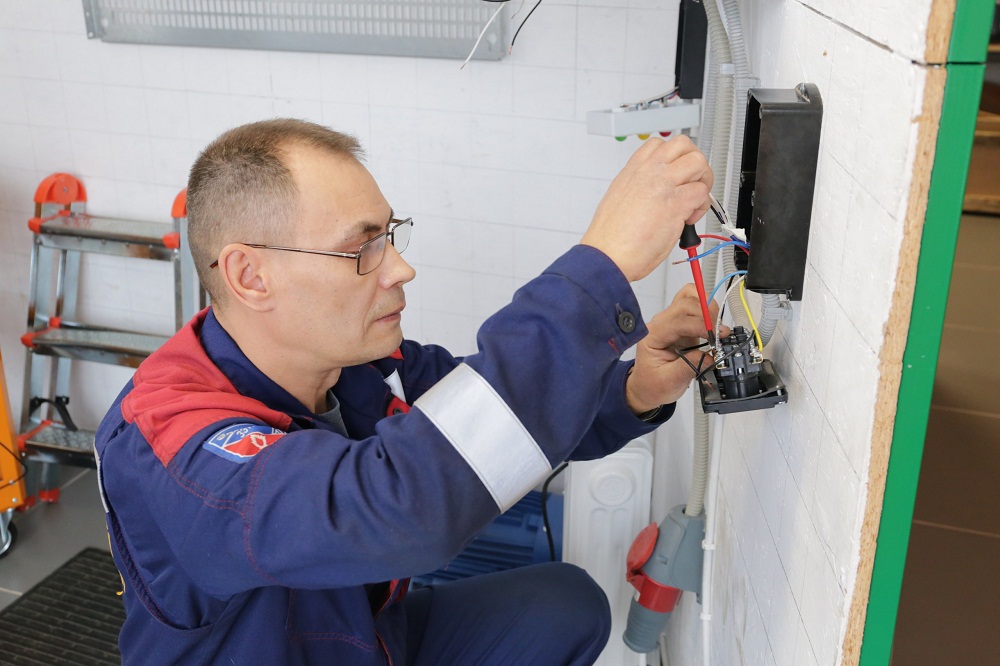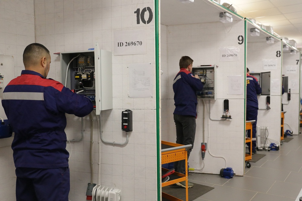 Тринадцать участников, девять из которых – молодые люди до 26 лет, проходили тестирование по вопросам профессионального блока и собирали электрическую схему подключения реверсивного электродвигателя.
