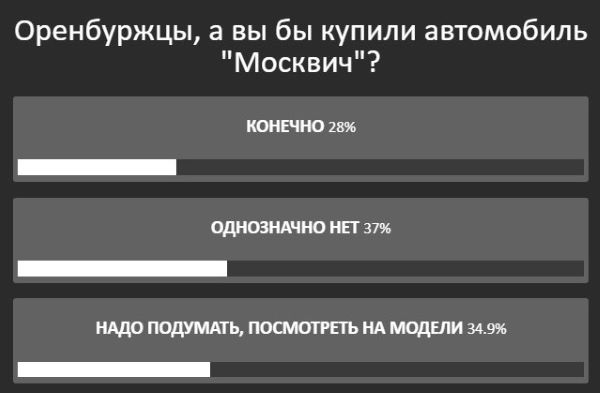 В ходе нашего опроса прикупить новую машинку этой модели изъявили желание порядка 28 процентов респондентов, еще более трети сказали, что "нужно подумать, посмотреть на модели". В общем, спрос однозначно будет, хотя сообщалось, что стоить новые "Москвичи" будут от 1,6 миллиона до 2 миллионов рублей.