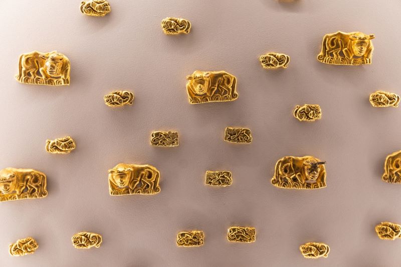 Уникальность и ценность показа заключается еще и в том, что после реставрации здесь представлены фрагменты вышивки погребального облачения сарматской жрицы (V-IV вв. до н. э). За два года работы был воссоздан первоначальный орнамент, украшавший ее одежды - вышивка из золотого бисера и стекляруса, а также ракушек каури, кораллов и лазуритов и около 400 цветов-розетт из штампованного золота.