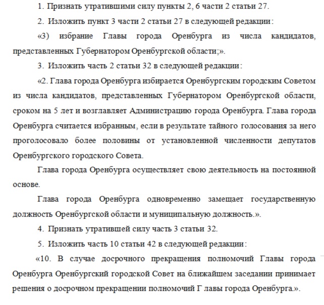 Согласно планируемым нововведениям, глава Оренбурга будет избираться депутатами Оренбургского городского Совета из числа кандидатов, которых представит губернатор области. Тайным голосованием его должны поддержать более половины всего депутатского корпуса. Везунчик будет замещать одновременно и государственную должность Оренбургской области, и муниципальную.