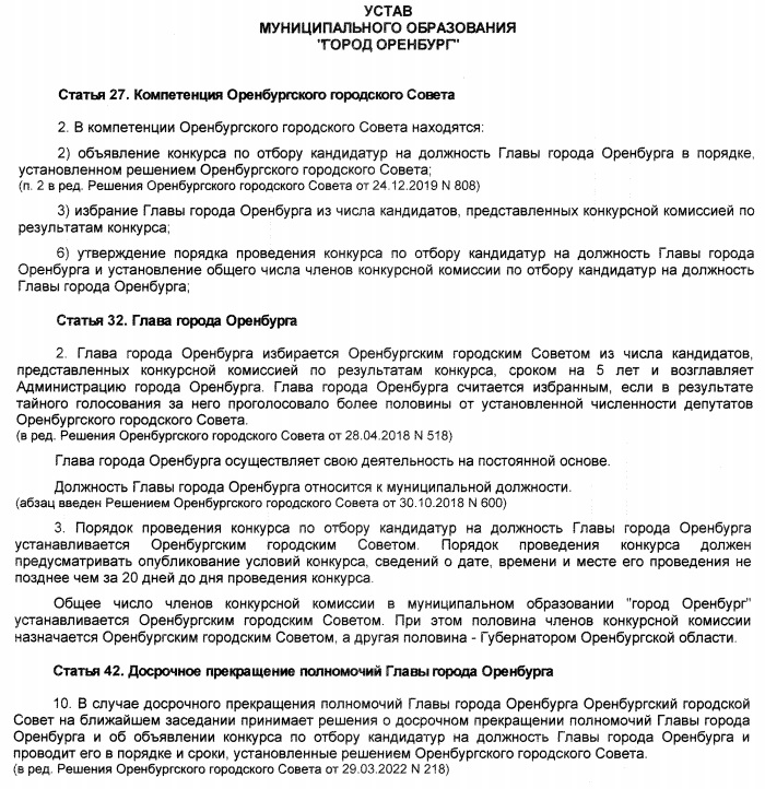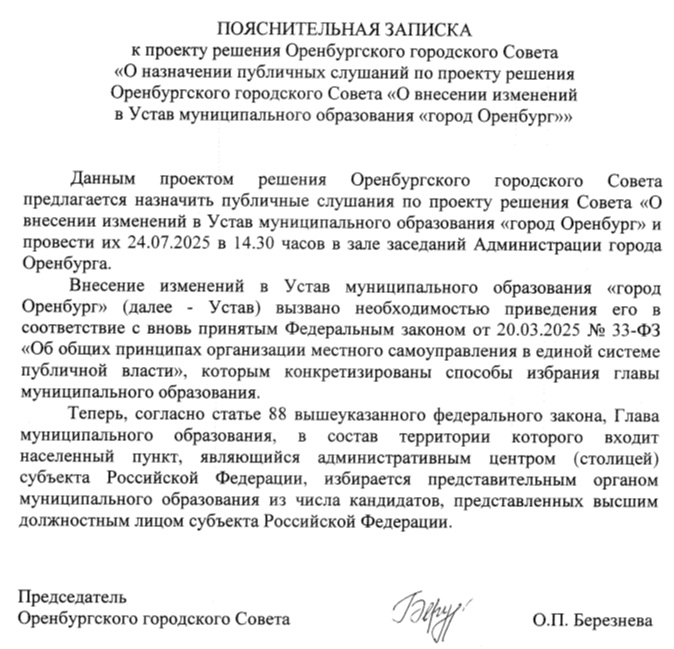 Чтобы в Оренбурге на практике могли быть применены новые варианты избрания главы муниципального образования - избрание среди кандидатур, предложенных губернатором (в соответствии с ФЗ от 20.03.2025 № 33-ФЗ «Об общих принципах организации местного самоуправления в единой системе публичной власти»), требуется внести изменения в Устав города.